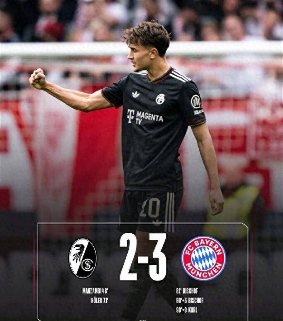 北京时间4月4日深夜,德甲第28轮上演了一场足以载入史册的惊天逆转。 在弗赖堡的欧罗巴公园球场,拜仁慕尼黑在比赛第80分钟还以0-2落后,眼看就要吞下失利的苦果。 然而,接下来的19分钟里,剧情发生了180度大转弯。 20岁的德国中场比朔夫在第81分钟和补时第2分钟连入两球,将比分扳成2-2平。 就在所有人都以为比赛将以平局收场时,补时第9分钟(第99分钟),18岁的锋线小将伦纳特·卡尔门前包抄铲射破门,完成了不可思议的读秒绝杀。 拜仁最终3-2逆转弗赖堡,在先赛一场的情况下积分达到73分,以12分的巨大优势领跑德甲积分榜。 这场胜利让拜仁成为德甲历史上第三支在比赛第80分钟仍两球落后却最终逆转取胜的球队,而比朔夫也在一线队生涯第34次出场中,打入了自己的拜仁处子球,并且一进就是两个。